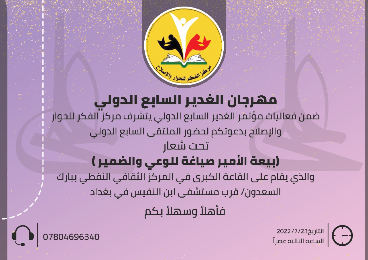 أن يدعوكم لحضور مؤتمر الولاية الدولي السابع وسيكون ضمن فعالياته الملتقى الدولي السابع تحت شعار ( بيعة الأمير صياغة للوعي والضمير )